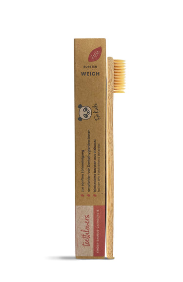 Die nachhaltige Bambus-Zahnbürste hat einen kleinen Bürstenkopf und weiche Borsten für eine schonende Zahnreinigung der ersten Zähnchen.