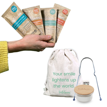 Wir geben uns größte Mühe mit unserem Verpackungskonzept ZeroWaste für das tägliche Zähneputzen zu ermöglichen! Durch das Refill System für Zahnliebhaber:innen können wir super leichten und Abfall-reduzierten Versand ermöglichen. Nachdem Du Deine Lieblingssorte gefunden hast, kannst Du Dein teethlovers Gläschen monatelang mit dem Vorratsglas wieder auffüllen. Die kompostierbaren Refill-Bags wiederum füllen Dein Vorratsglas auf und sind kostensparend im Abo erhältlich.